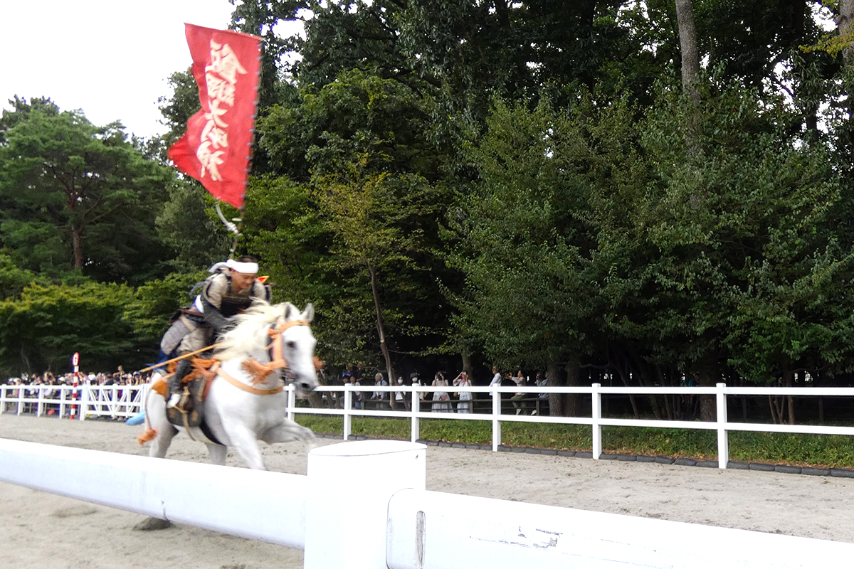 続いて観戦したのは相馬野馬追の甲冑競馬。こちらは余裕を持って会場に向かったので最前列を確保できた。昨年は南相馬まで足を運んだが、今年は現地に行けなかったため、こうして一部でも見られて嬉しかった。