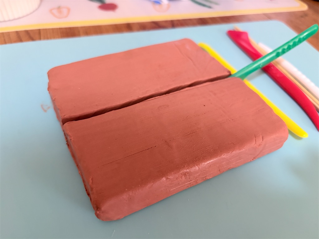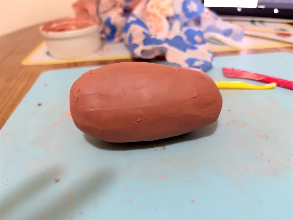 粘土をひとまず半分にわけた。すぐ乾くので、使わない分は濡らした不織布に包む。