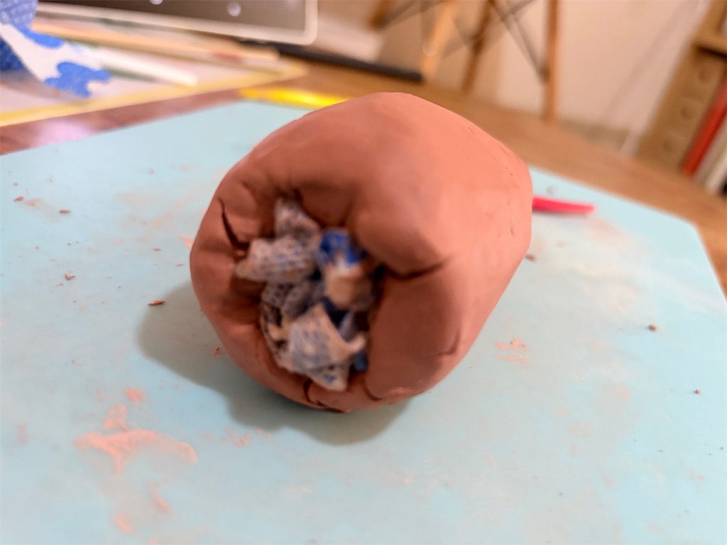 口の部分を粘土でふさぎ、指でなめらかに整える。