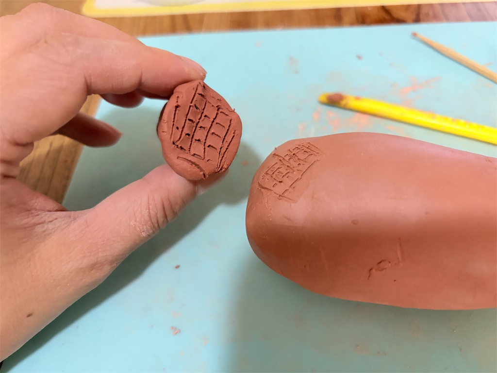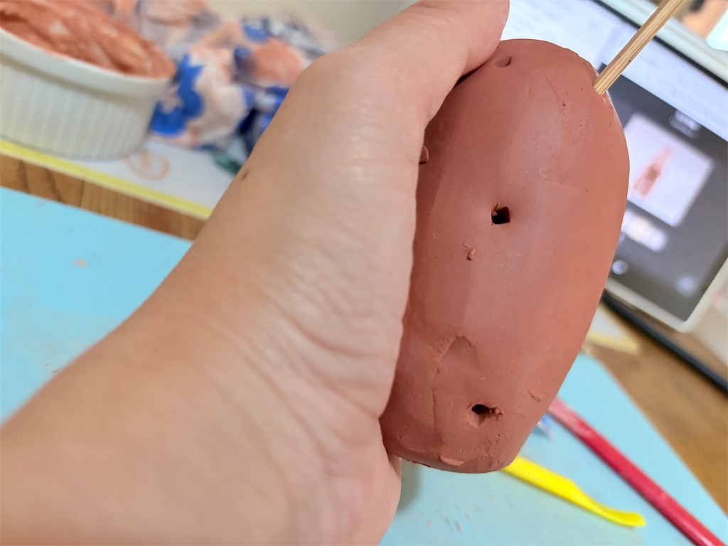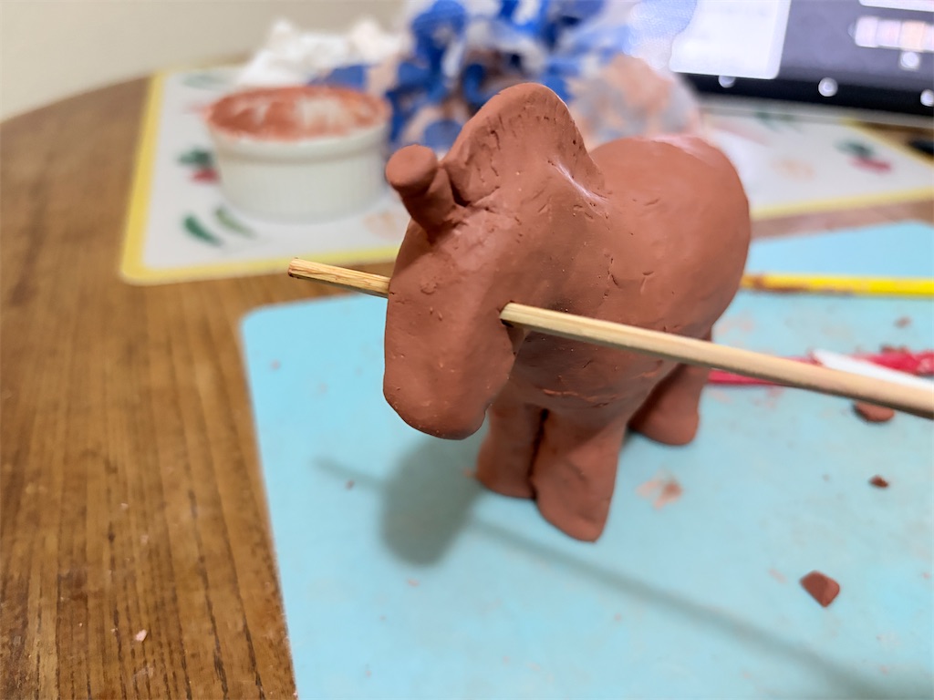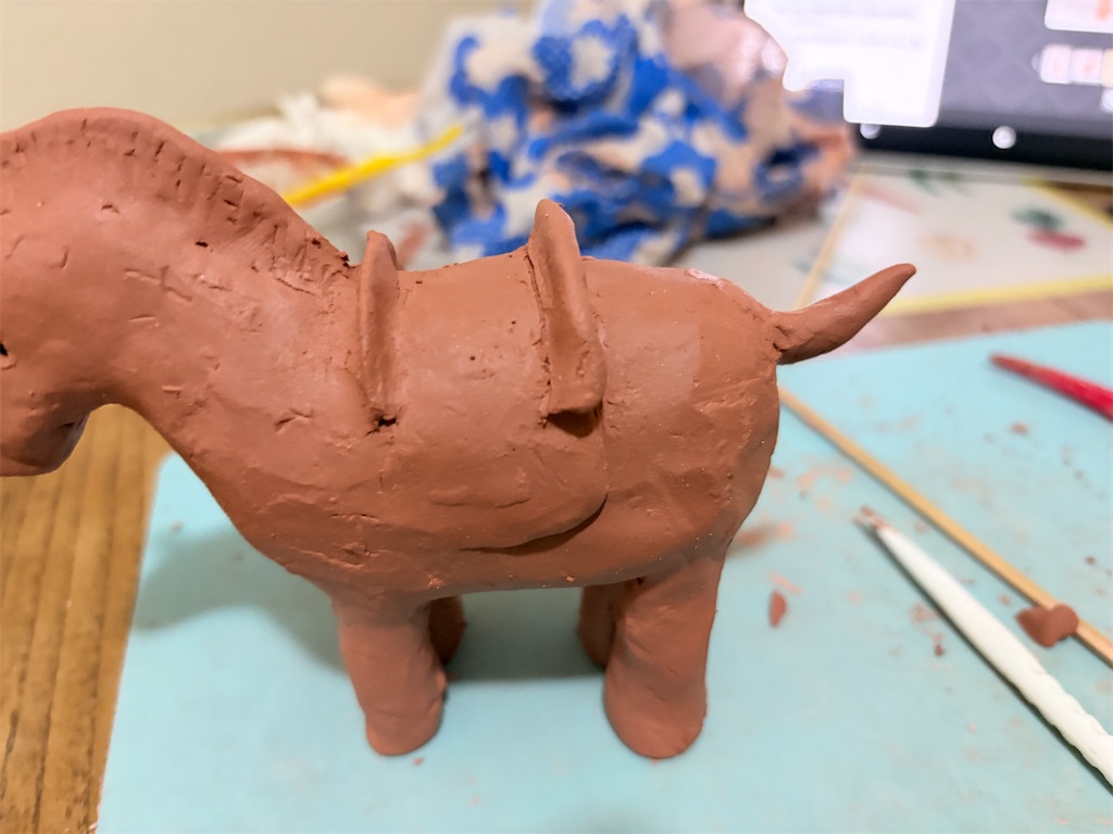 竹串で穴を開ける際、馬のお尻部分の粘土が他の部分より厚すぎることに気がづいた。後でヘラを使って厚い部分を切り落とし、調整した。