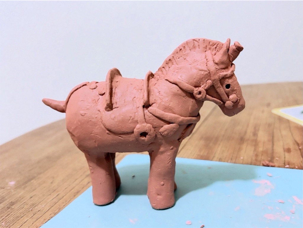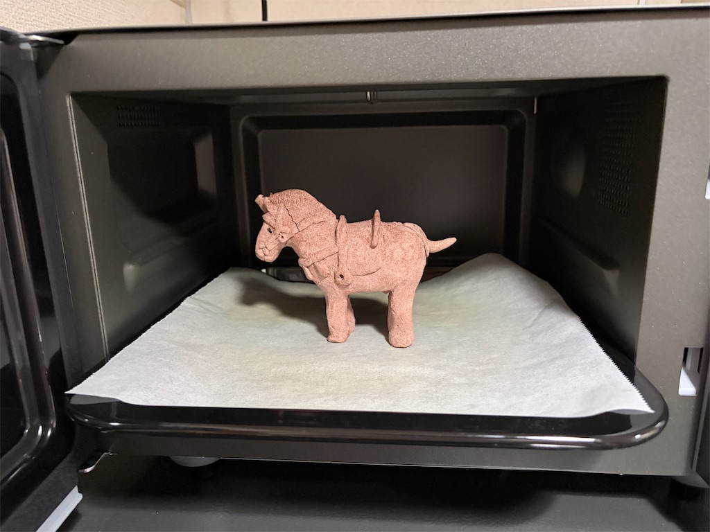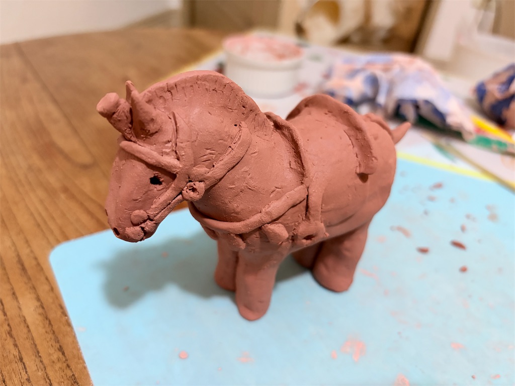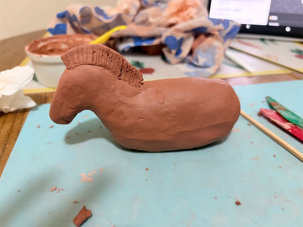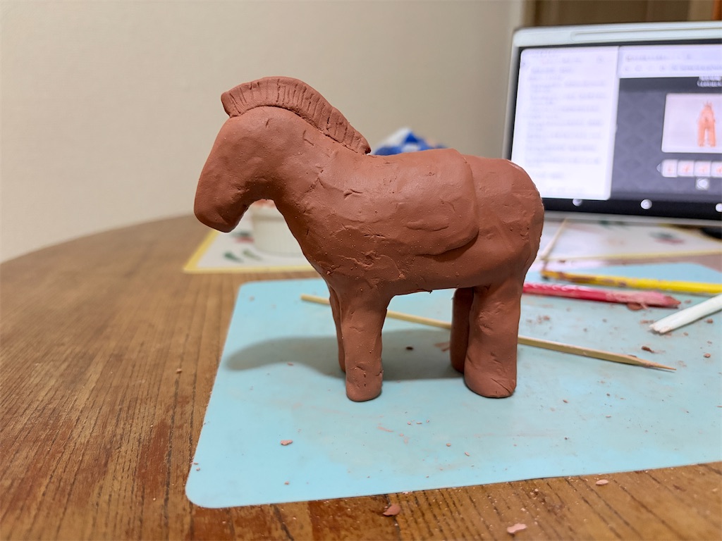 本当は東京国立博物館の平成館で見た馬形埴輪そっくりにつくりたかったのだが、気づけばずんぐりむっくりになってしまった。しかし、これが私の力量の限界である。この状態で7日ほど乾燥させてから、焼くことにした。