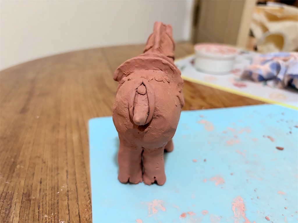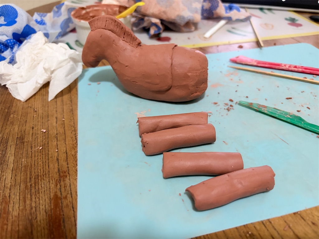 本物の馬形埴輪を見ると、足の後ろの窪みが粘土をカットする形で表現されていた。それを真似しようとしたが、ミニチュアだと細かい作業になり、かなり難しい。結果、なんだか汚くなってしまった。